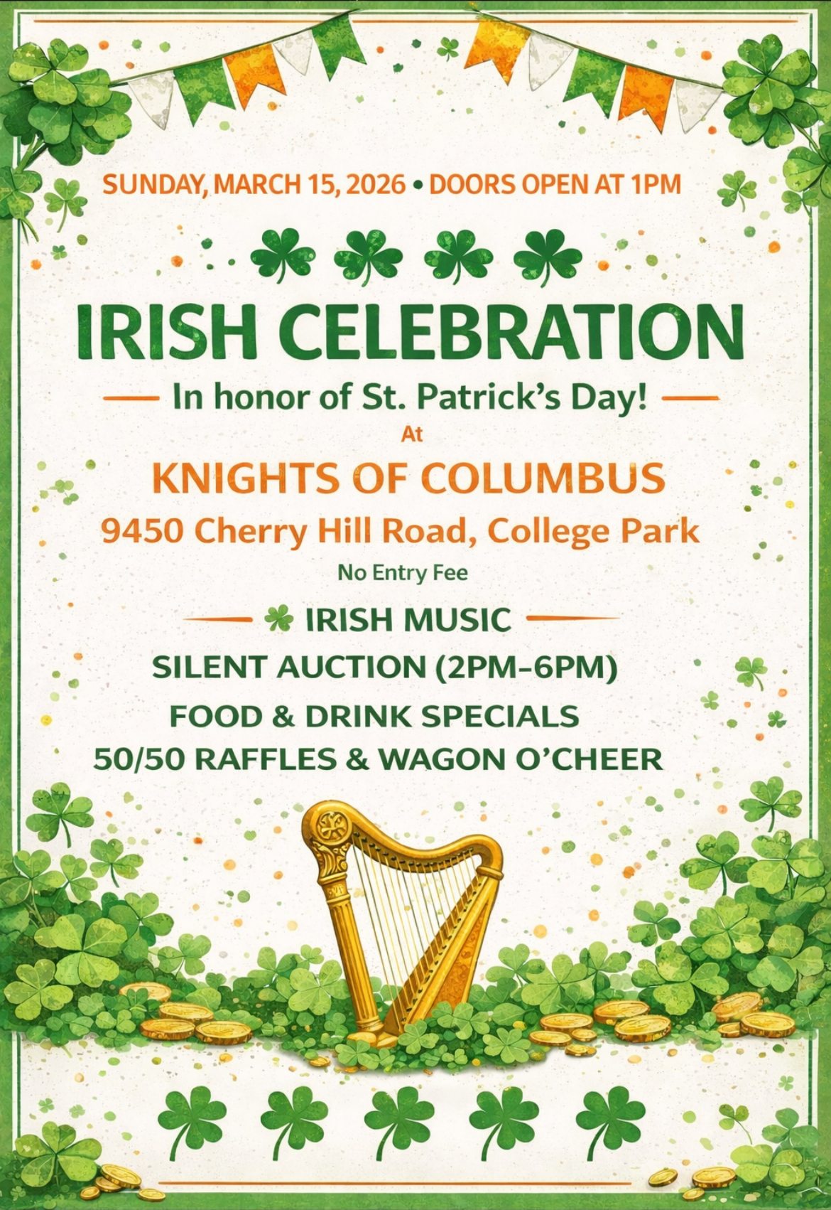 on Sunday, March 15th. Please see the attached flyer for all the information. That is it, I can't think of much else. Hope to see you all soon! Take care.KofC Clubhouse